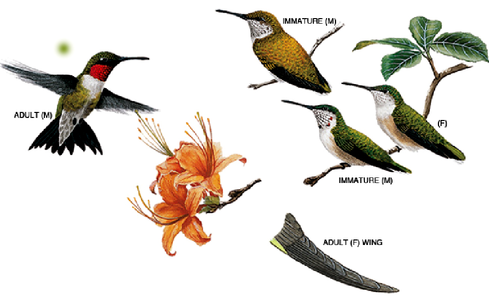 "El macho tiene la garganta roja iridiscente (que puede parecer negra al cambiar de ángulo) y en la hembra es blanca. El resto de las partes inferiores es blanco grisáceo. Las alas son casi negras. La cola es corta, en el macho es ahorquillada y en la hembra casi no lo es, y además ésta tiene las tres plumas externas a cada lado con puntas blancas. Los juveniles son similares a la hembra pero pueden tener algunas plumas rojas en la garganta y un tono algo dorado en el dorso." (es.wikipedia.org)